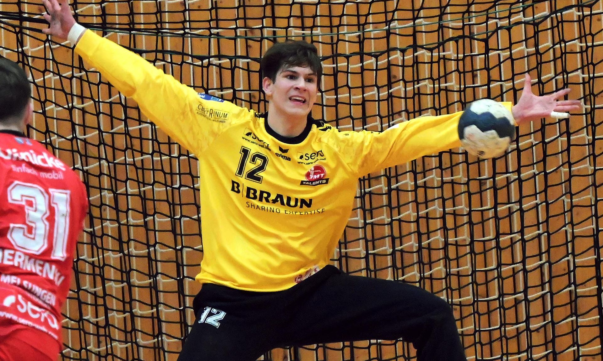 Von Beginn an stand das mannschaftliche Duell im Zeichen der Torjäger Lino Duketis und Leander Altena. Waren im Hinspiel beide 13 Mal erfolgreich, knüpften sie auch im Rückmatch nahtlos an. Als Gästetrainer Lars Halfmann nach knapp 14 Minuten zur Auszeit bat stand das Duell der Teams 10:7, jenes der Individualisten sechs zu drei. Zu Gunsten von Duketis, der überhaupt nicht zu halten war. Zwei Tempogegenstöße, zwei Siebenmeter, ein wunderschöner Heber – klasse! Und Altena? Der brauchte schon einen Nachwurf im Anschluss an seinen gegen Kim Hüter (Foto: Heinz Hartung) vergebenen Siebenmeter.