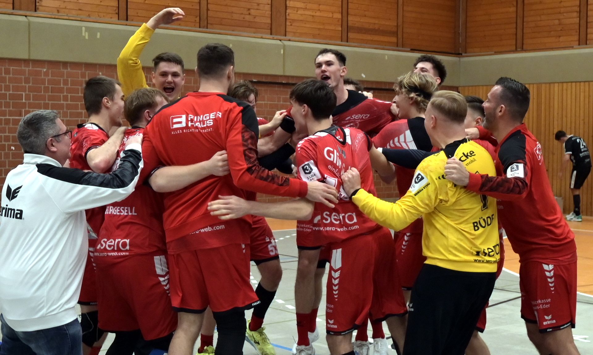 Erst im Herzschlagfinale bei bereits abgelaufener Uhr siegte die MT Melsungen 2 beim Nordhessenderby gegen den GSV Eintracht Baunatal mit 23:22 (10:7). Tom Wolf traf und bescherte den jubelnden Gastgebern (Foto: Heinz Hartung) einen gelungenen Jahresauftakt.