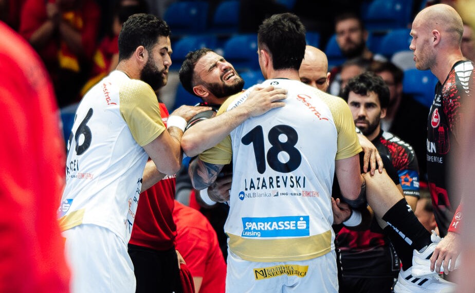 Die Verletzung ereignete sich in der zehnten Spielminute, als der 26 Jahre alte Handballer bei einer Angriffsaktion unglücklich mit dem rechten Fuß aufkam und sich dabei das Knie verdrehte. Darmoul sank unter Schmerzen zu Boden und wurde von den gegnerischen Spielern Milan Lazarevski und Achraf Margheli vom Feld getragen (Foto: Käsler). Danach ging es für Darmoul direkt ins Krankenhaus.