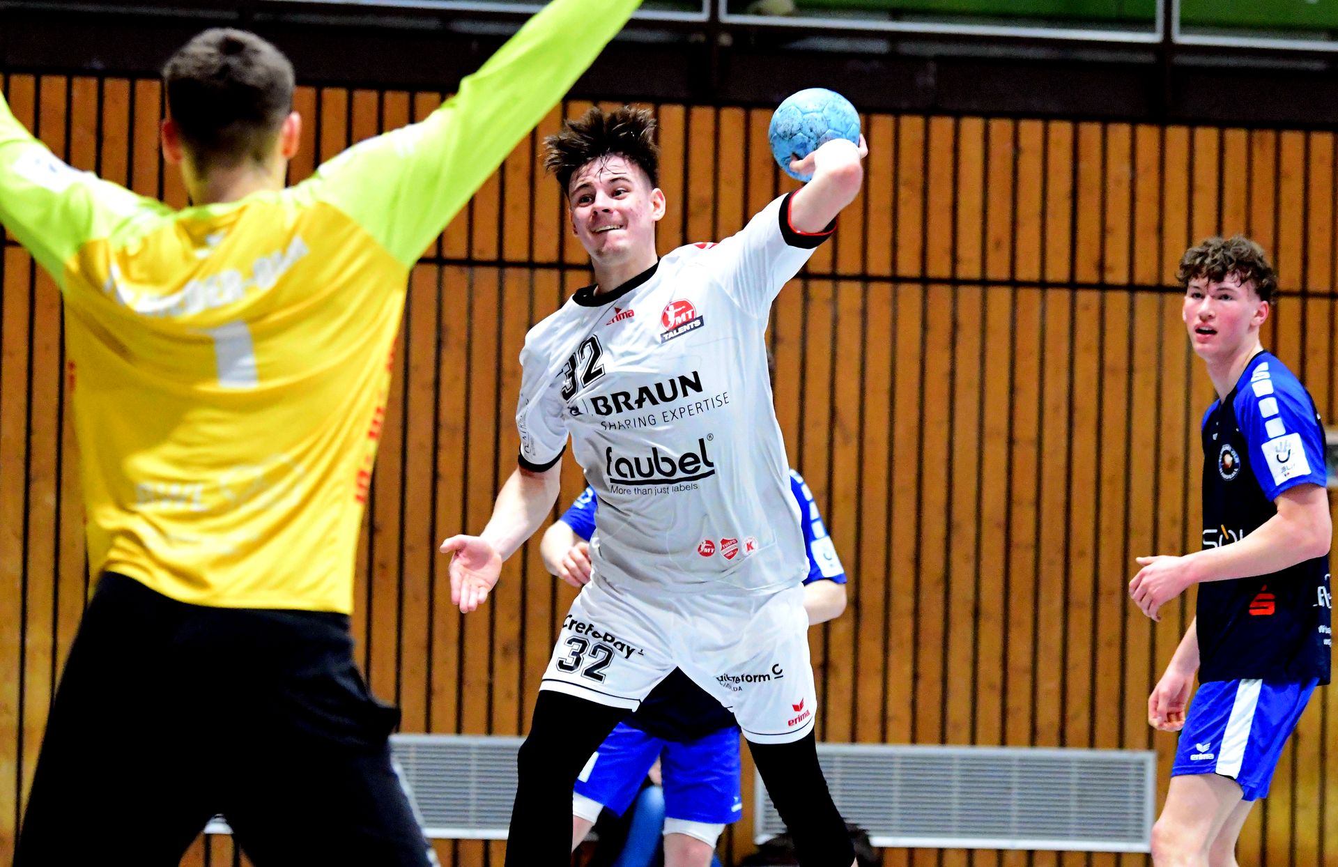 In erster Linie die augenfällige Verminderung der Fehlerzahl nach dem Seitenwechsel. Leon Stehl machte einfach da weiter, wo er vor dem Kabinengang aufgehört hatte: Er traf – zum 21:19 (38.) sogar aus dem Rückraum, zum 25:21 (44.) vom Kreis. Aber die zuvor eher blassen Jost Liebergesell und Jonathan Atting tauten endlich zumindest zeitweise auf, düpierten die Gastgeber-Deckung mehrere Male erfolgreich. Dazu griff der taktische Griff von Trainer Florian Maienschein, die gegnerische 5:1-Deckung über den siebten Feldspieler in die defensivere 6:0 zu zwingen. Und als das Kleingruppenspiel mit Jason Wilfer Mitte der zweiten Hälfte endlich ins Laufen kam, war auch die letzte Schwachstelle im Angriff erfolgreich bearbeitet.