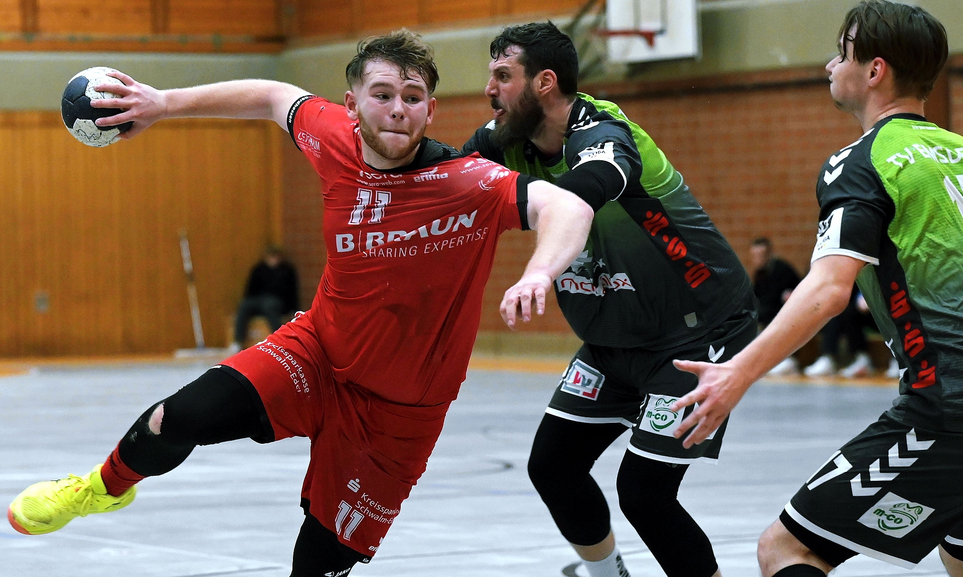 Vom Anwurf weg bestand akute Sturmwarnung. Es war wohl eine der furiosesten Anfangsphasen, die man in der Stadtsporthalle je zu sehen bekam. Mit Volldampf rannten beide Mannschaften hoch und runter, ließen sich auch mit ihren Abschlüssen praktisch keine Zeit. Tore fielen so schnell, dass die Ansage kaum hinterherkam. Keine drei Minuten waren absolviert, da stand es nach Marc Esches Tempogegenstoß 2:4, gerade einmal knapp sechs waren vorbei, als Bruno Eickhoff schon zum 5:5 ausglich. Und da hatten beide Torhüter bereits je eine Parade auf dem Zettel, die Gastgeber zusätzlich einen Wurf übers Tor. Irre, dieses Tempo!