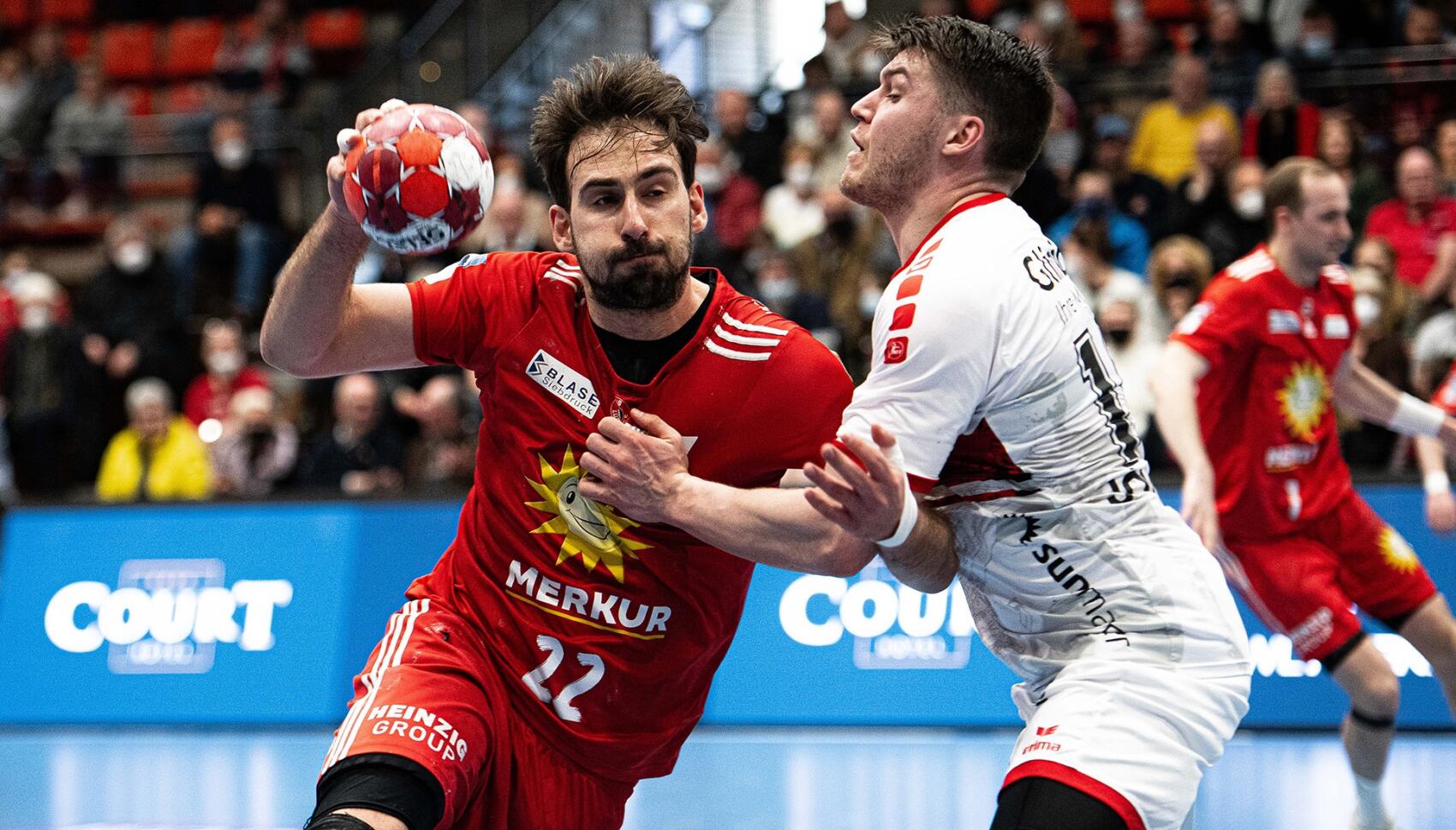 Unser Foto zeigt eine Szene aus dem jüngsten Gastspiel der MT beim TuS N-Lübbecke am 3. April 2022: Das Duell zwischen Melsungens Elvar Örn Jonsson (rechts) und Luka Mrakovcic könnte sich am Samstag wiederholen. (Foto: Alibek Käsler/MT)