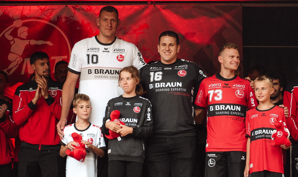 Neuzugang Dainis Kristopans, Torwart Nebojsa Simic und Rechtsaußen Timo Kastening waren die Auserkorenen, die erstmals zeigen durften, in welchem Outfit der nordhessische Handball-Bundesligist in der neuen Spielzeit in der Rothenbach-Halle und in der Ferne auflaufen wird. Unterstützt wurden die Profis dabei von den jungen Fans Yael, Maeline und Laouen Broschkat.
