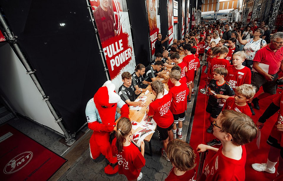 In eigens gestalteten roten Event-T-Shirts durchliefen die Teilnehmerinnen und Teilnehmer einen Parcours mit acht abwechslungsreichen Stationen – direkt auf dem Spielfeld der MT, ähnlich wie bei einem Zirkeltraining. Unterstützt wurden sie dabei von den Bundesliga-Profis der Mannschaft.
