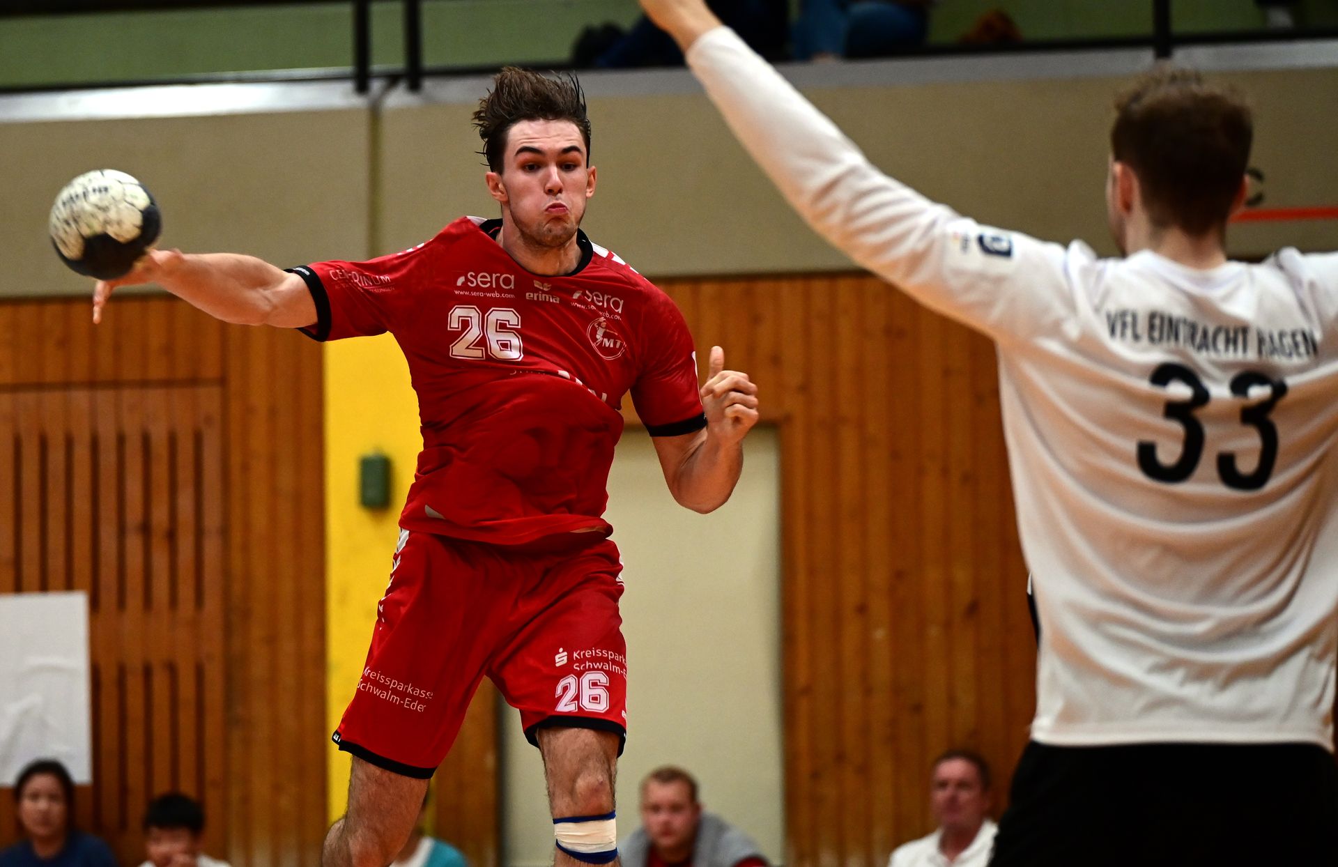 Die zu verteidigen nach Wiederbeginn nicht leicht war. Vorn passte es weiterhin, weil Tom Wolf so richtig aufdrehte. Mit zwei Toren und einer Vorarbeit für Bruno Eickhoff, der gleich noch eins nachlegte, kurbelte der Rückraum-Linke den Angriff mächtig an. Hinten allerdings klafften teilweise große Lücken, sogar im Innenblock. Hagen hatte die gute Moral der ersten 30 Minuten konserviert, profitierte vom bärenstarken Sven Brockmeyer zwischen den Pfosten, der Nils Thorben Schmidt schon früh abgelöst hatte. Lukas Meier und Arne Quittmann verkürzten auf 24:22 (37.).