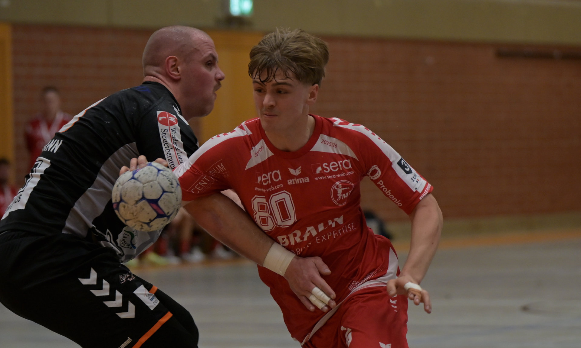 Schon der Start war, um es vorsichtig auszudrücken, suboptimal für die Gastgeber. Gleich zwei technische Fehler mit Ballverlusten, zwei schnell und konsequent herausgespielte Treffer der Gäste, schon wieder ein früher Rückstand. Der noch höher hätte ausfallen können, wenn nicht Kim Hüter den Siebenmeter von Louis Elsässer pariert hätte. So war Jonas Rieckes erstes Tor nach langen fünf Minuten immerhin sofort der Anschluss zum 1:2.