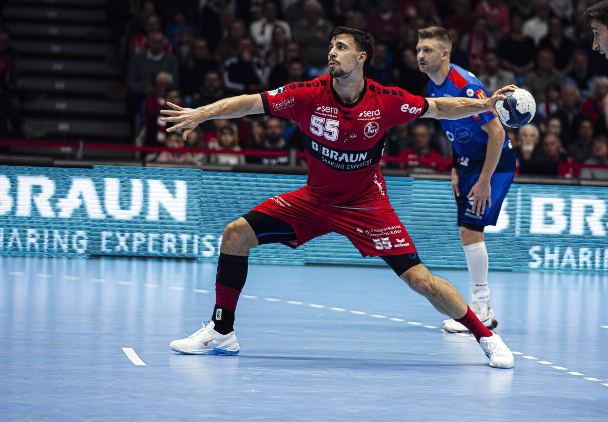 War bei den Melsungern von Beginn an spürbar. Ob beim grandiosen, wenn auch riskanten Anspiel von Julius Kühn auf Arnar Freyr Arnarsson oder beim Zickzack-Lauf von Erik Balenciaga. Dass es nach gerade einmal vier Minuten schon 4:2 stand, verwunderte deshalb nicht. Auch die Spielzüge, die etwas später bei Dimitri Ignatow auf Rechtsaußen endeten, waren sehenswert. Allein, ihm fehlte das Glück beim Abschluss. So wie auch Florian Drosten auf der linken Seite. Aber es gab immer wieder Lösungen gegen die nicht einmal schlecht stehende Mauer in Blau. Auch als das Personal wechselte und Dainis Kristopans wie auch Elvar Örn Jonsson die Parts von Erik Balenciaga und Ivan Martinovic nicht minder Erfolg bringend übernahmen. Keine Frage, der Heimspiel-Flow der Melsunger war (und ist) ungebrochen.