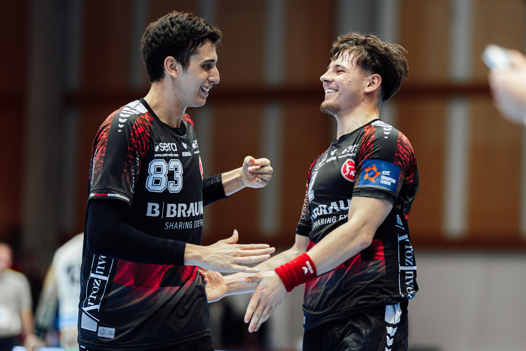 Auf unserem Foto bedankt sich Leon Stehl (rechts) bei Ian Barrufet während des Spiels gegen Vardar. Barrufet hatte Stehls Premierentreffer vorbereitet. (Foto: Käsler)